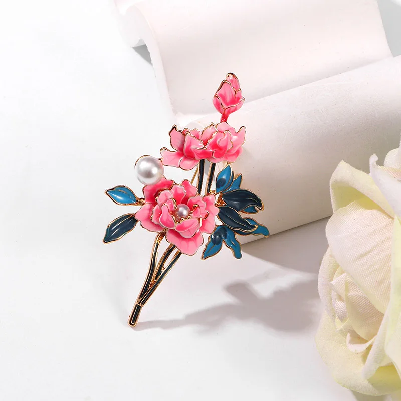 Chinese Style Purple Peony Flower Brooch For Women Dainty Plant Pearl Shiny Rhinestone Pins Party Office Wedding Corsage Jewelry